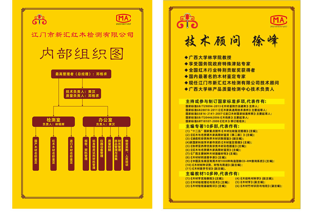 江門市新匯紅木檢測有限公司位于中國古典家具三大流派“廣作”的發(fā)源地廣東新會的紅木專業(yè)市場新會古典家具城。在中國古典家具之都博覽中心的三樓擁有日常檢測及辦公場地約625平方米,由國內(nèi)紅木材質(zhì)鑒別三大權(quán)威專家之一、享受國務(wù)院特殊津貼的廣西大學(xué)林學(xué)院徐峰教授任總顧問。公司技術(shù)力量雄厚、檢測儀器先進齊全,可開展木塊取樣及家具無損檢測。擁有多名木材研究博士、碩士、中級工程師、助理工程師等科研人員和多名專家顧問團隊,每年在專業(yè)雜志刊物發(fā)表論文多篇;擁有國內(nèi)外紅木及名貴硬木木材標本200多種,永久顯微切片300多種;每年開展紅木檢測業(yè)務(wù)4,000單以上。同時公司還擁有進口高新技術(shù)設(shè)備工業(yè)CT射線透視儀、3D立體彩色掃描儀等先進設(shè)備,對家具質(zhì)量進行專業(yè)檢測并提供產(chǎn)品質(zhì)量的參考意見。